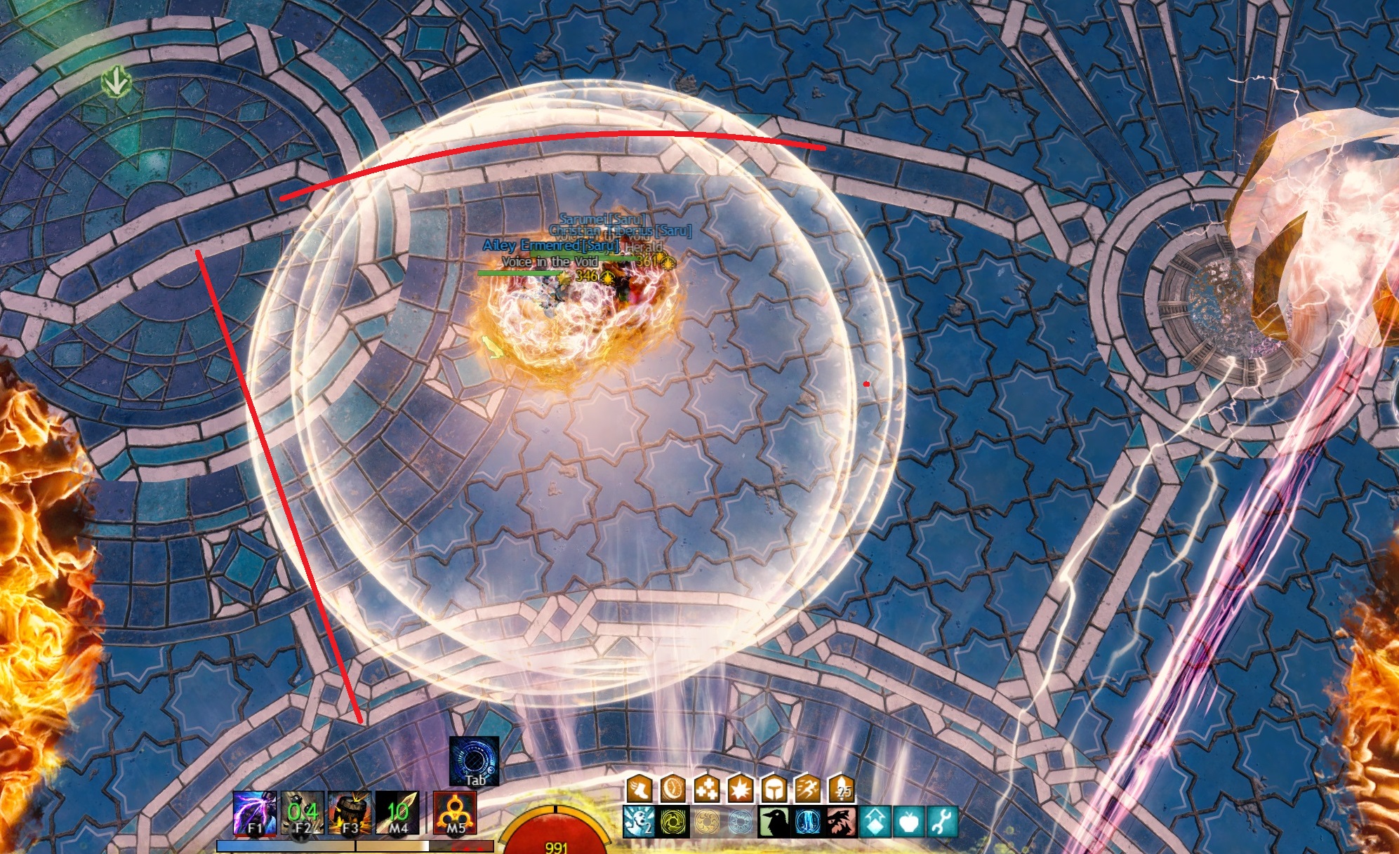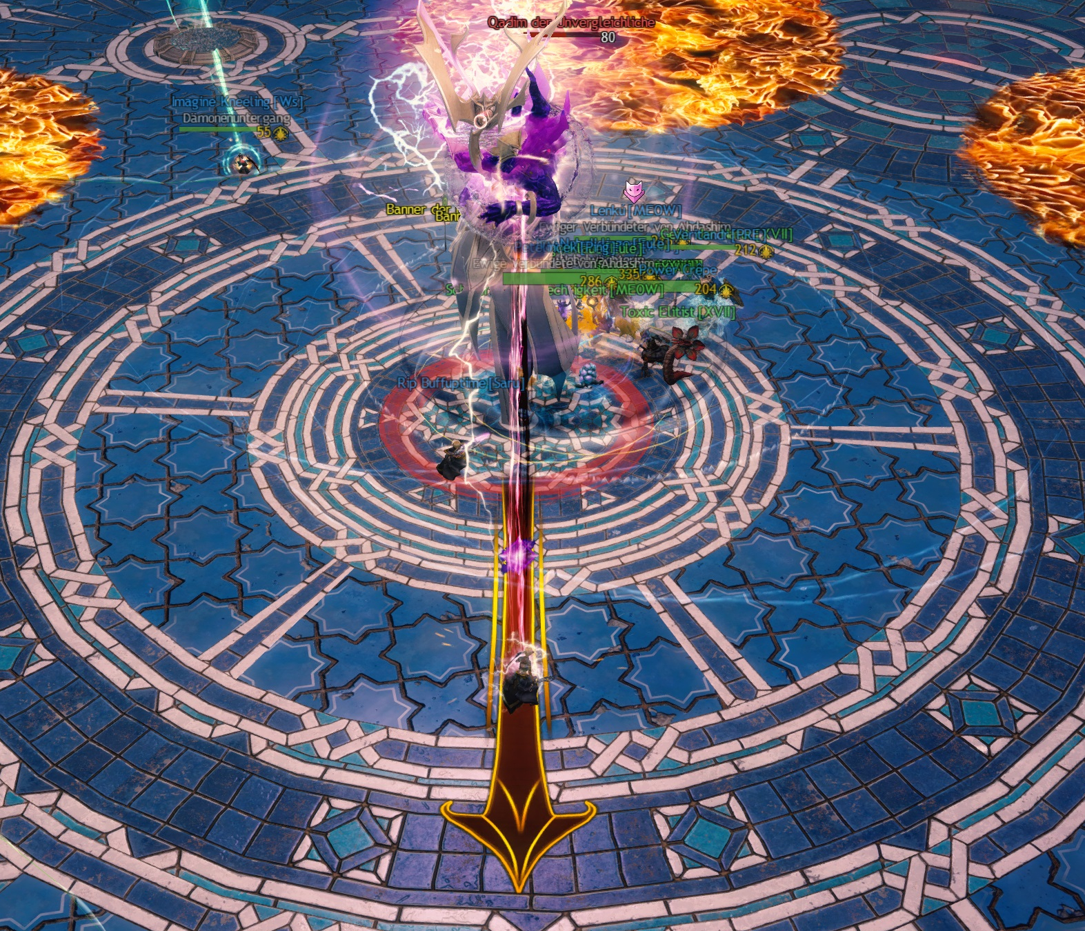 Stern markiert. Da die Kiter die Kugeln im Uhrzeigersinn einfangen – also links von ihrem Pylonen – sollte man optimalerweise immer auf der rechten Hälfte eines Pylonen tanken. Dadurch können die Kiter beruhigt auf der linken Seite stehen und werden nicht von Qadims Angriffen getroffen.