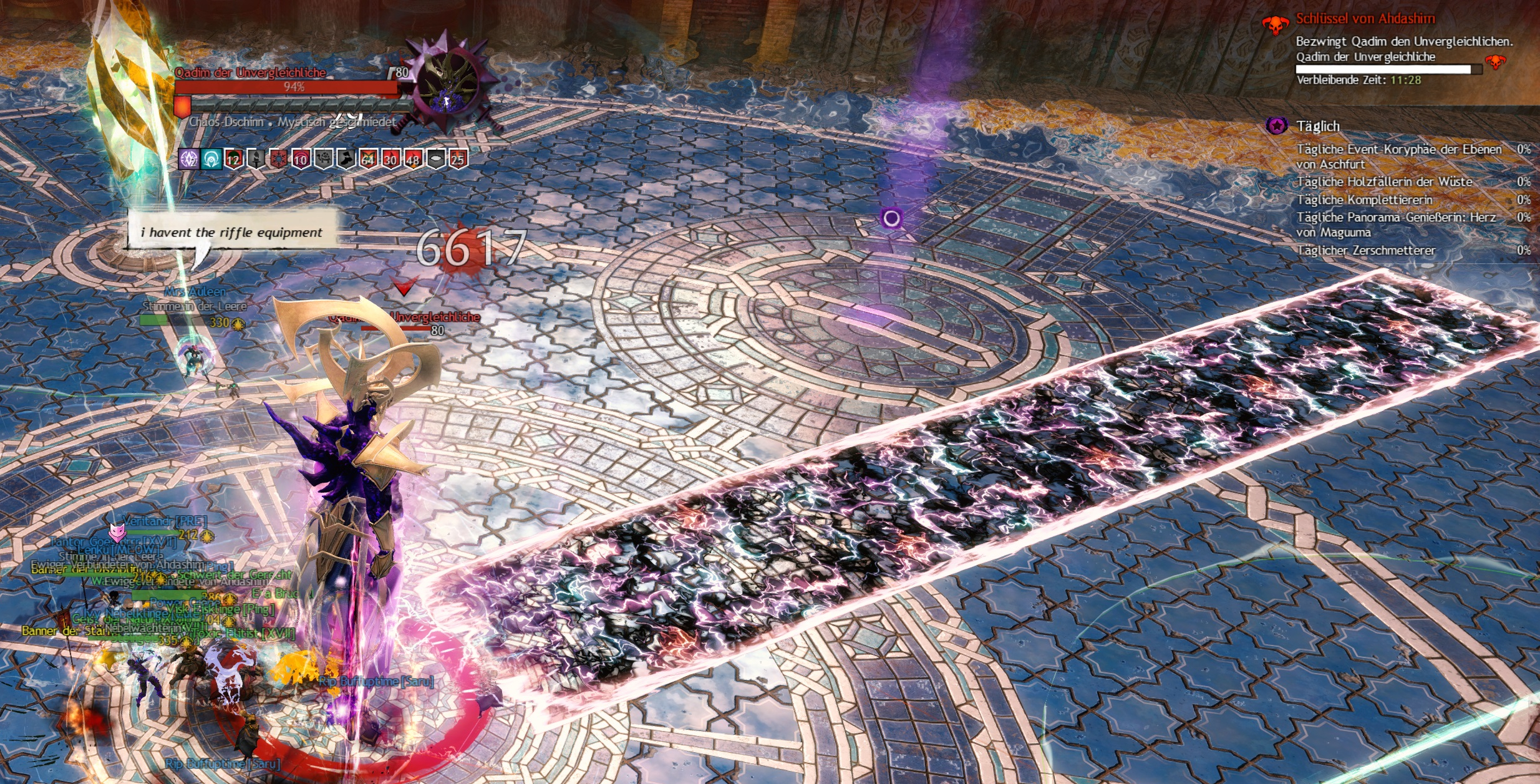 Kreis bei 60 % Leben von Qadim getauscht haben. Für die Herausforderungsmechanik bei 40 %, 30 % und 20 % Leben haben wir "Bleibt standhaft!" genutzt, um das Zurückschleudern zu verhindern. Das Management der schlechten Verbidnungen nach 20 % Leben war leider nicht sehr gut. Diese wurden fast immer innerhalb der Gruppe verteilt. Dass mehrere Spieler gegen Ende vom Regen des Chaos getroffen wurden, war etwas unschön. Allerdings ist hier gut zu sehen, wie wichtig der Umgang mit dieser Attacke im Herausforderungsmodus ist.