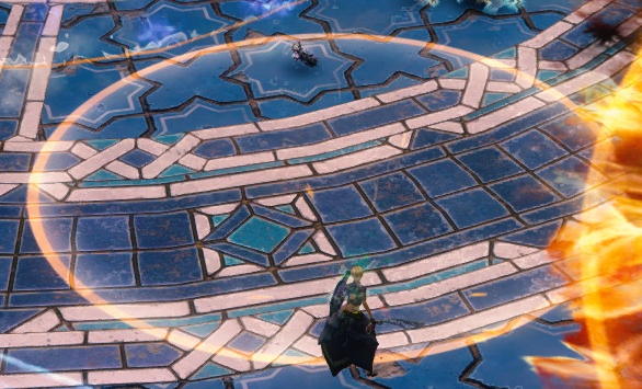 Qadim schickt elektrische Energie entlang der weißen Linien der Arena. Wenn man davon getroffen wird, bekommt man etwas Schaden sowie zwei Stapel