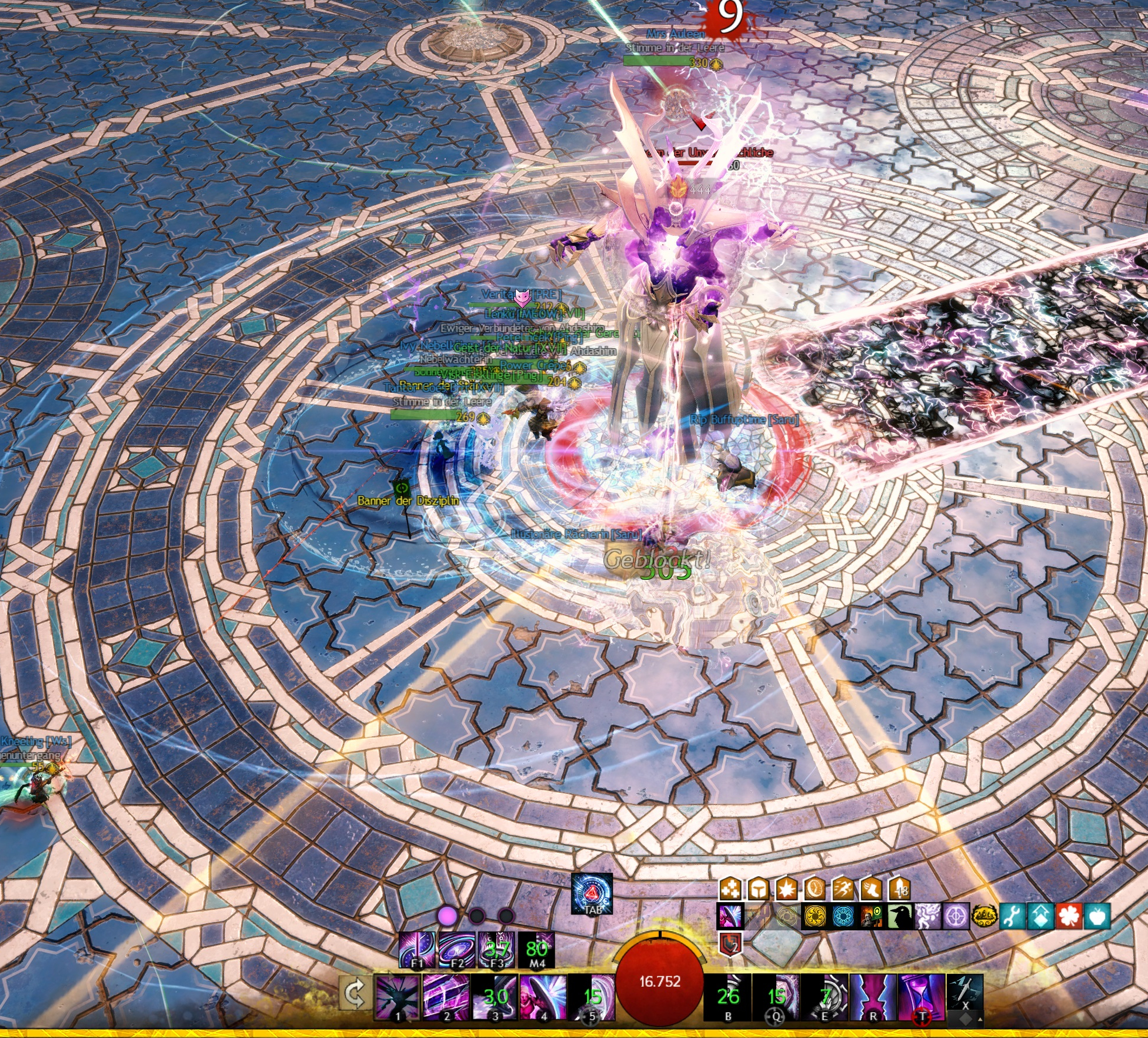 Zum Blocken der Ätherschläge soll an dieser Stelle noch einmal darauf hingewiesen sein, dass die Schadensfelder kurz nach der Ankündigung auftauchen. Somit bedarf es etwas Übung, die Blocks gut zu timen. Es ist jedoch überhaupt kein Problem, wenn man von einigen Bodenfeldern der Attacke getroffen wird. Die Fertigkeit Schwert #4 bietet sich vor allem für das Blocken der Kraft der Vergeltung an. Alternativ kann man auch das Mantra der Konzentration für