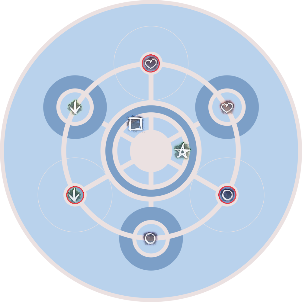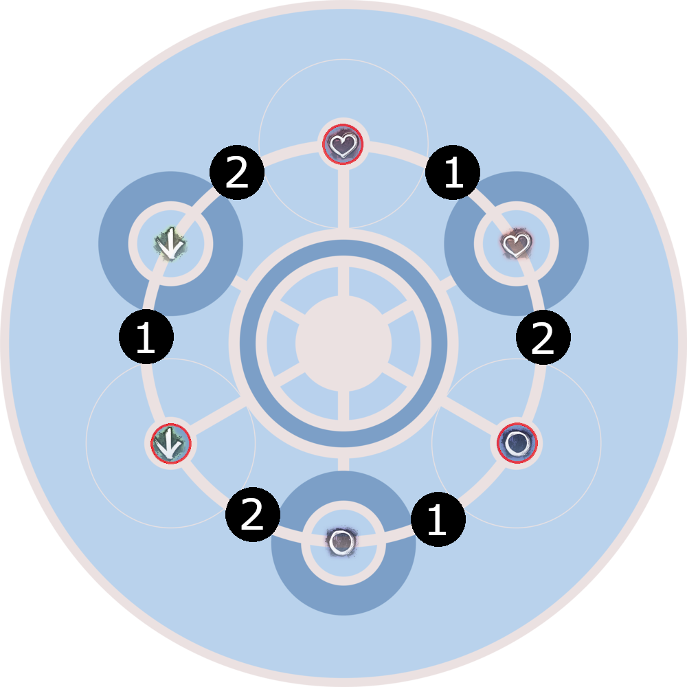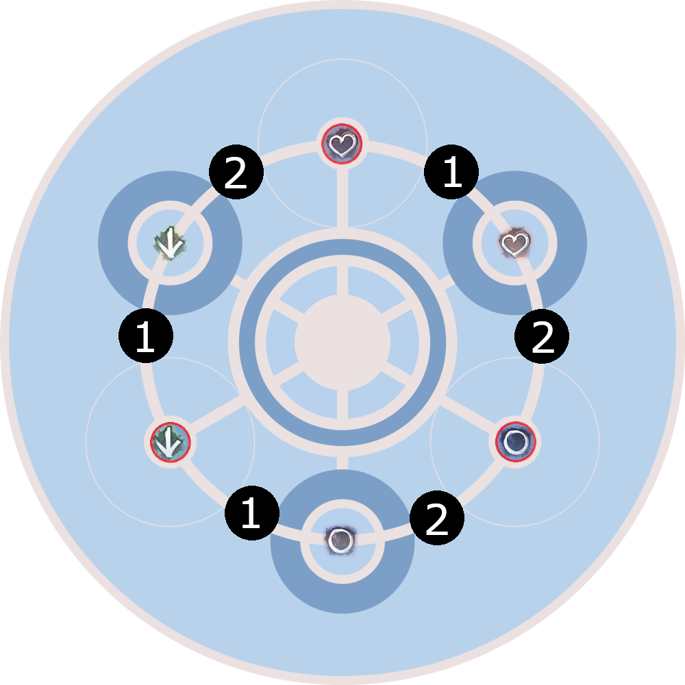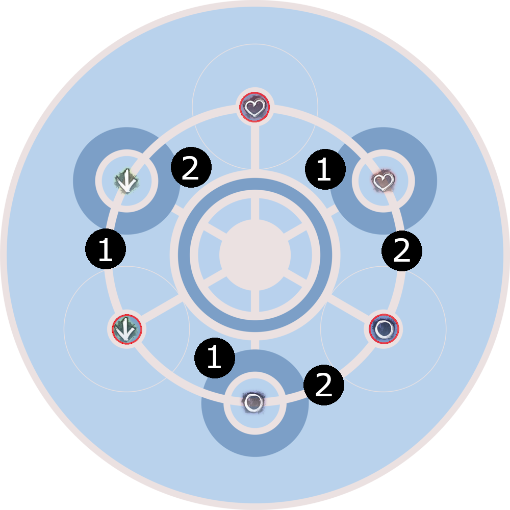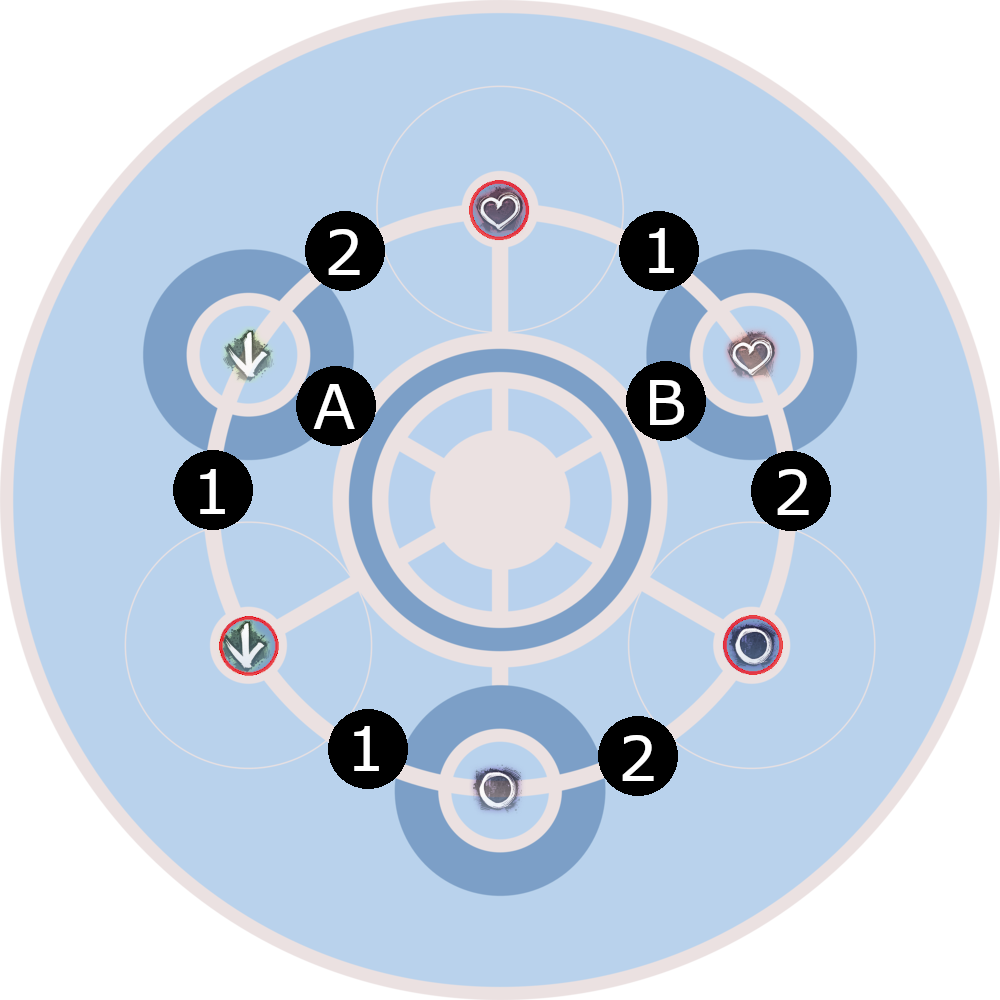 Herz markiert, allerdings ohne rote Umrandung. Die schematische Karte wurde uns von Elite Insight bereitgestellt. Die zusätzlichen Markierungen (Einsatztrupp-Markierungen, Feuerfelder) wurden von Valfyn eingefügt. Dies gilt für alle schematischen Karten in den folgenden Abschnitten (mehr Informationen). In den folgenden Abschnitten ist ab und zu vom „inneren Kreis“ die Rede. Damit ist der weiße Ring innerhalb des dunkelblauen Rings in der Mitte der Arena gemeint.