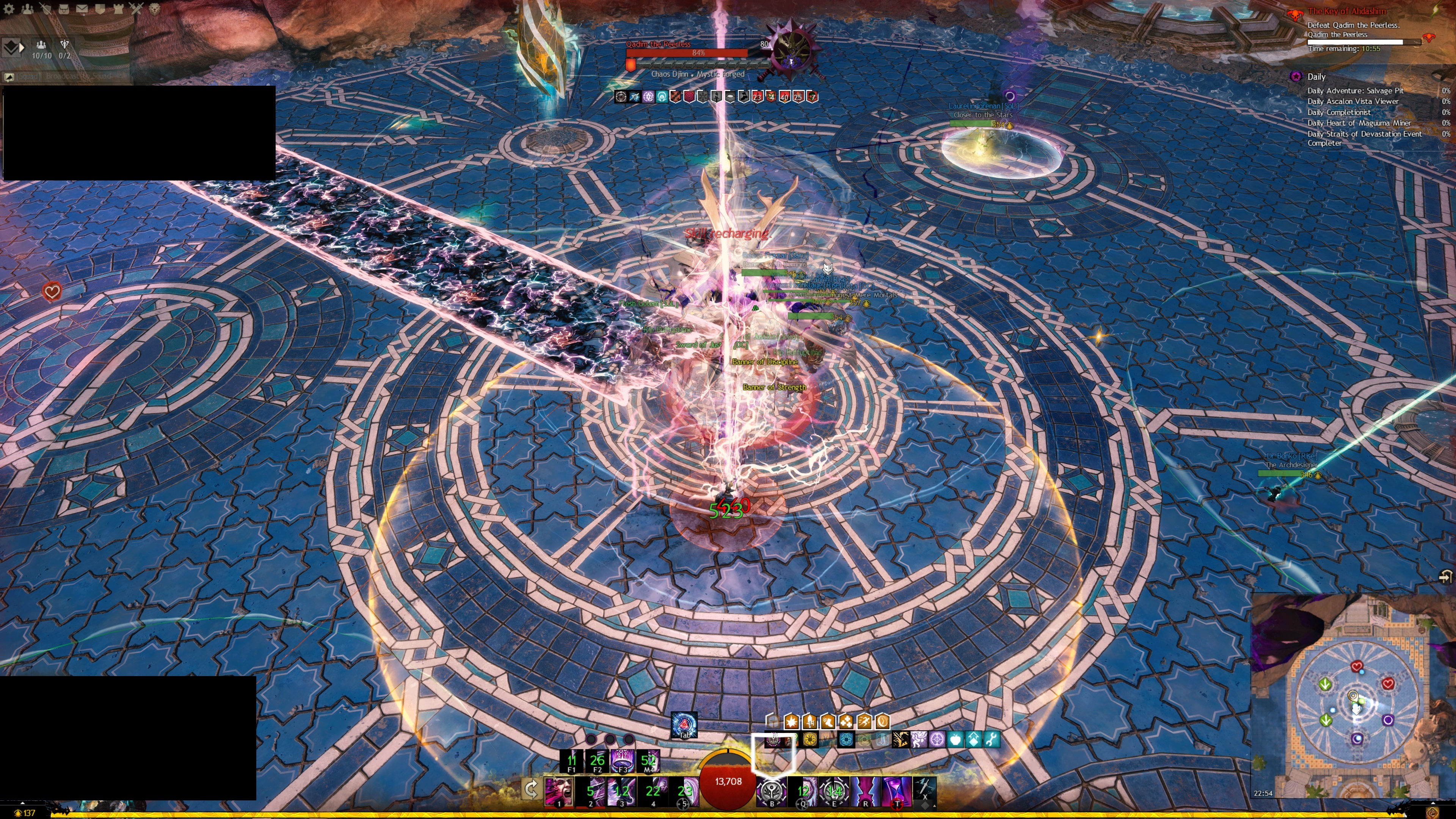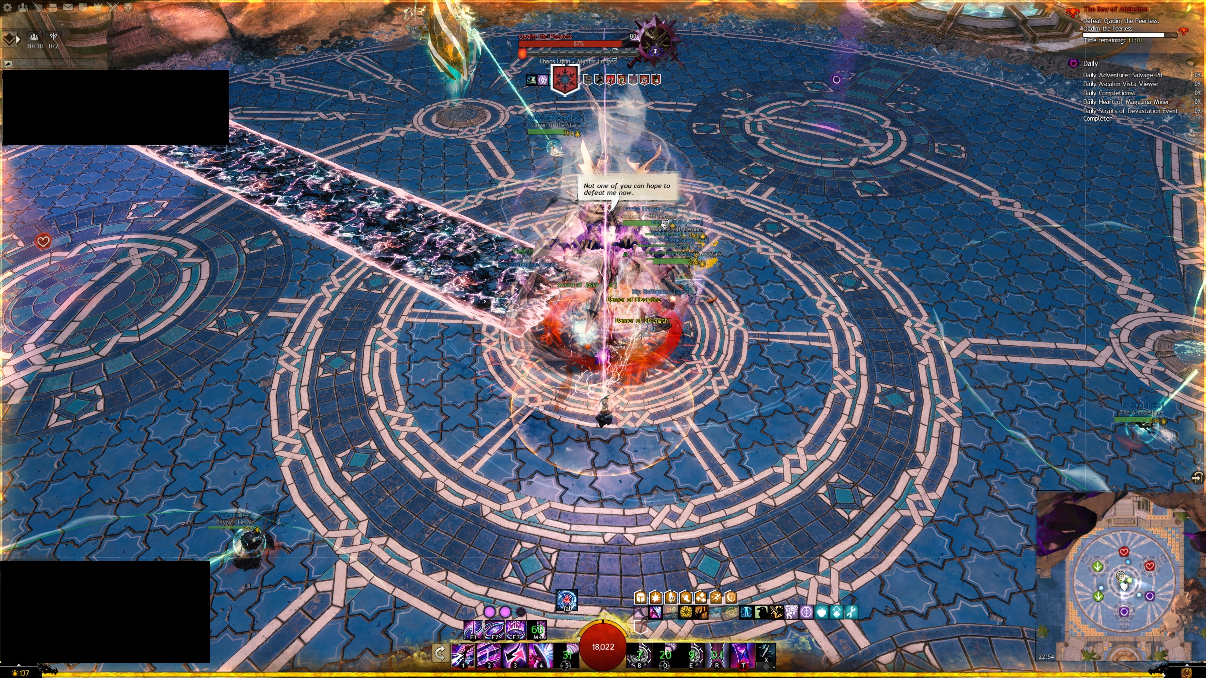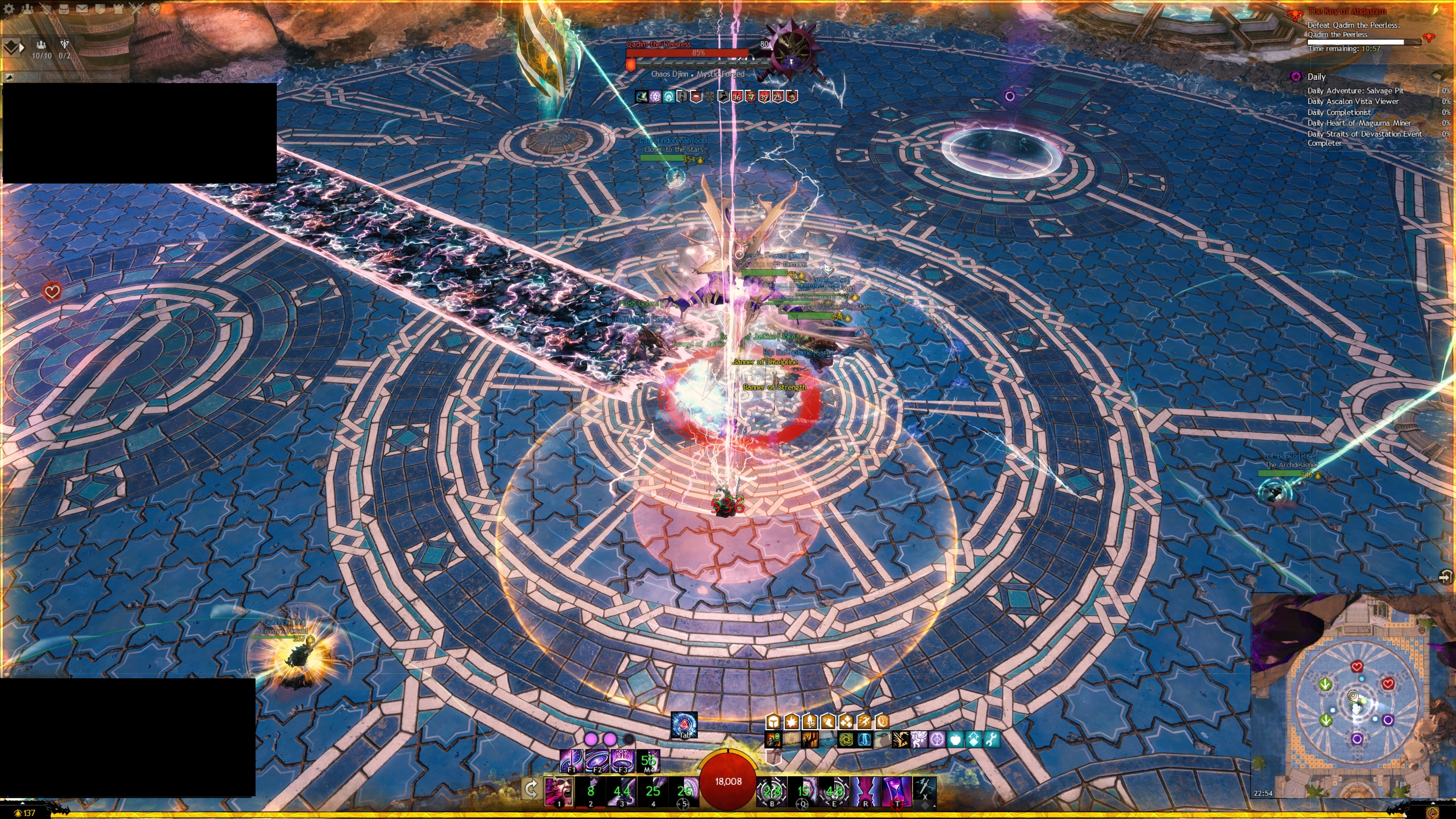 Pfeil-Pylonen zulaufen, sollten die DPS-Spieler dabei helfen, diese zu töten. Außerdem kann Qadim ab 80 % seiner Lebenspunkte seine Trotzleiste aktivieren und einen Pylonen fokussieren. Wenn man seine Trotzleiste nicht innerhalb von ca. zehn Sekunden bricht, tötet Qadim den gesamten Einsatztrupp.