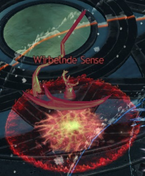 Bei dieser Attacke handelt es sich um einen orangefarbenen Kreis (= Vortex-Hieb, erstes Bild), der sich innerhalb von drei Sekunden füllt und anschließend Schaden verursacht. Nach dem Auslösen dieses Kreises taucht um den ursprünglichen Kreis herum ein Ring (= Orkan-Hieb, zweites Bild) auf, der ebenfalls Schaden zufügt. Daher wird dieser Angriff auch gerne mal als Donut bezeichnet. Beide Attacken treten immer gemeinsam auf, weswegen man sie eigentlich auch als eine Attacke zählen kann. Sie machen beide gut Schaden, wobei der Orkan-Hieb mehr Schaden macht als der Vortex-Hieb. Beiden Angriffen kann ausgewichen werden. Hier bietet sich an, die Ausweichrolle von außen in den Vortex-Hieb hinein zu machen oder innerhalb des Vortex-Hiebs auszuweichen. Dadurch wird man auf keinen Fall von dem Orkan-Hieb getroffen. Man sollte nie aus dem Vortex-Hieb nach außen ausweichen, da man dadurch quasi immer vom Orkan-Hieb getroffen wird. Die Attacke kann auch