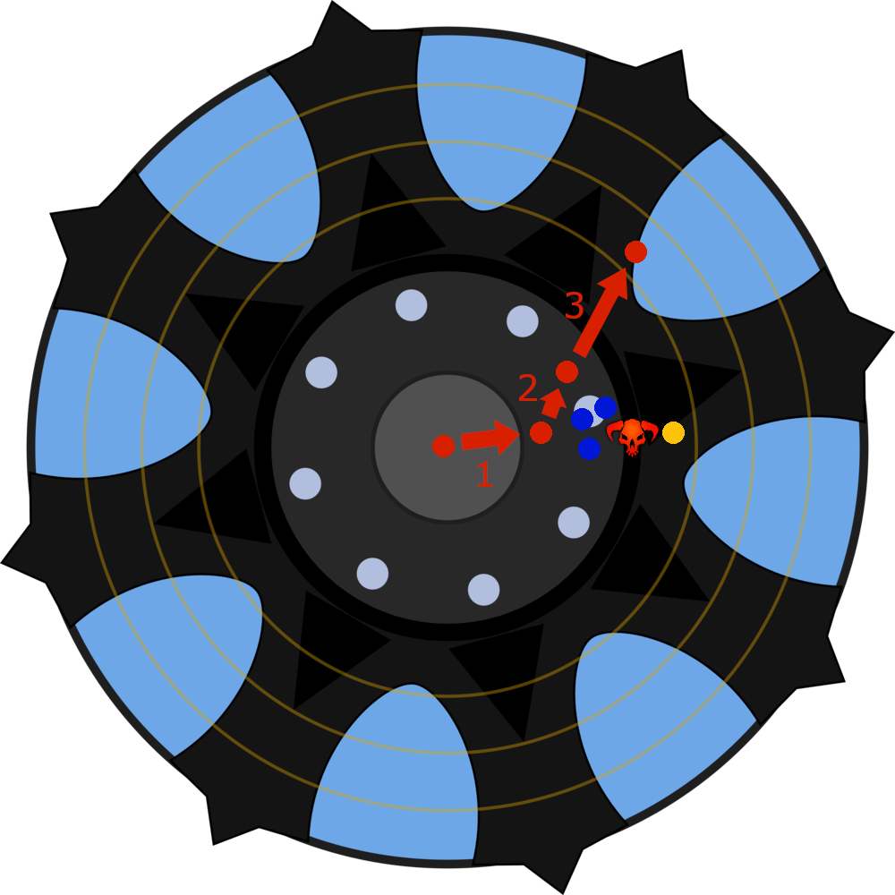 Wie im Abschnitt Gepeinigter Toter bereits erwähnt, taucht der erste Golem 20 Sekunden nach dem Erreichen von 90 % Lebenspunkte auf und anschließend alle 20 Sekunden ein weiterer. Letzten Endes ist es jedem Pusher selbst überlassen, wie er oder sie pushen möchte. Die besten Erfahrungen habe ich jedoch damit gemacht, wenn der Golem etwas auf die Gruppe zuläuft (1), man dann den Golem mit der Glyphe der Gezeiten nach links oder rechts schubst (2), bevor dieser die Gruppe vollständig erreicht. Anschließend schubst man den Golem mit dem Kurzdistanzschuss an den äußeren Rand der Plattform (3). Im Bild rechts soll dieses Schema verdeutlicht werden. Die blauen Punkte stellen dabei die Gruppe dar, der gelbe Punkt den aktiven Tank. Der Seelenlose Schrecken wird durch das Bosssymbol dargestellt.