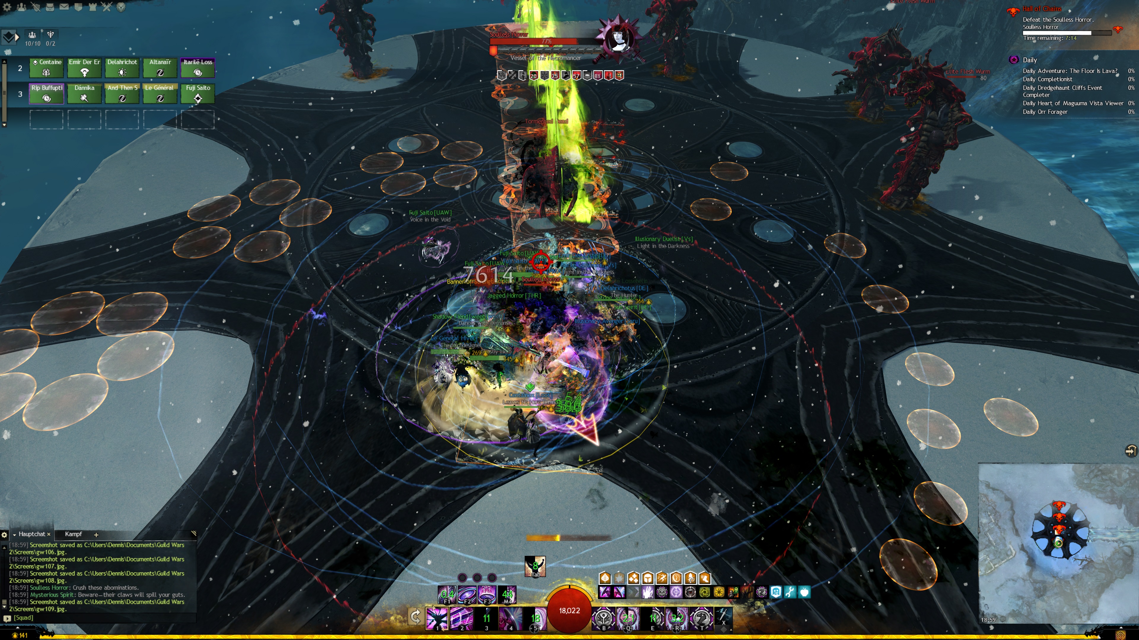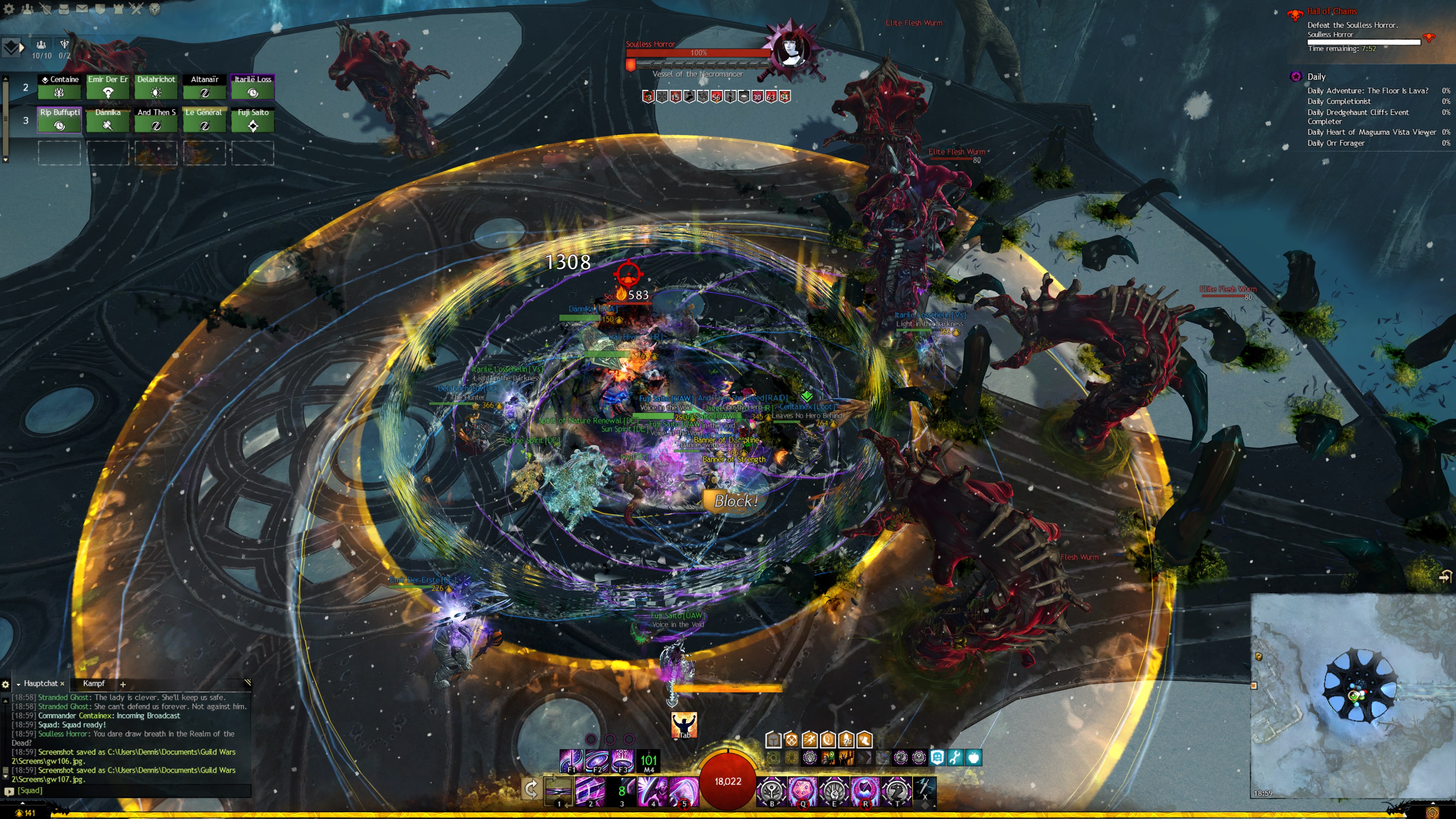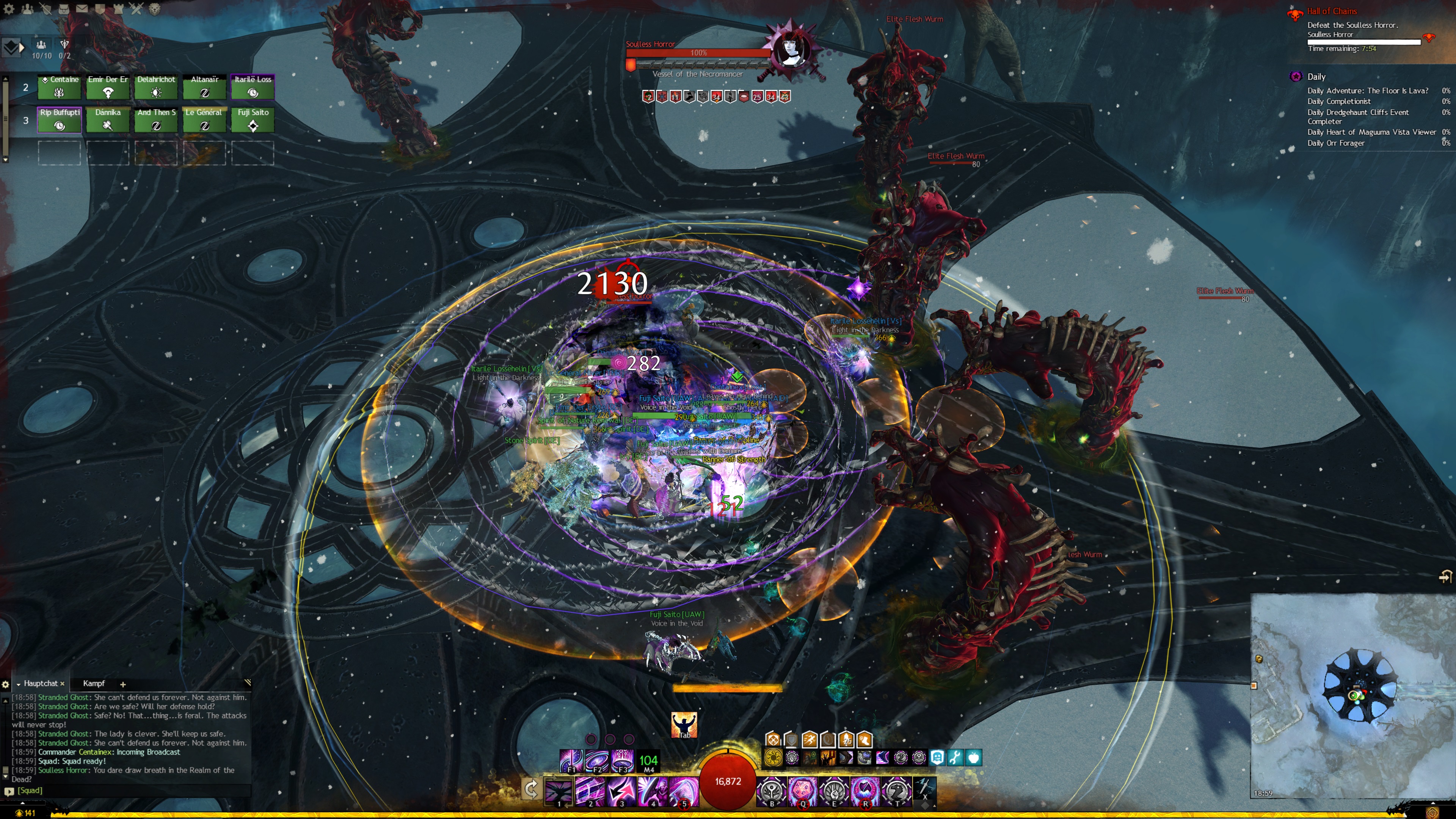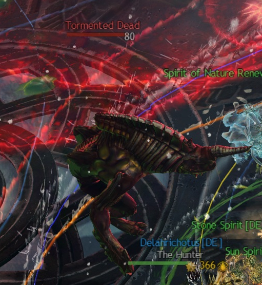 Der Seelenlose Schrecken schlägt auf den Tank ein und macht ca. 1000 Schaden. Zusätlich bekommen getroffene Spieler noch jeweils fünf Stapel