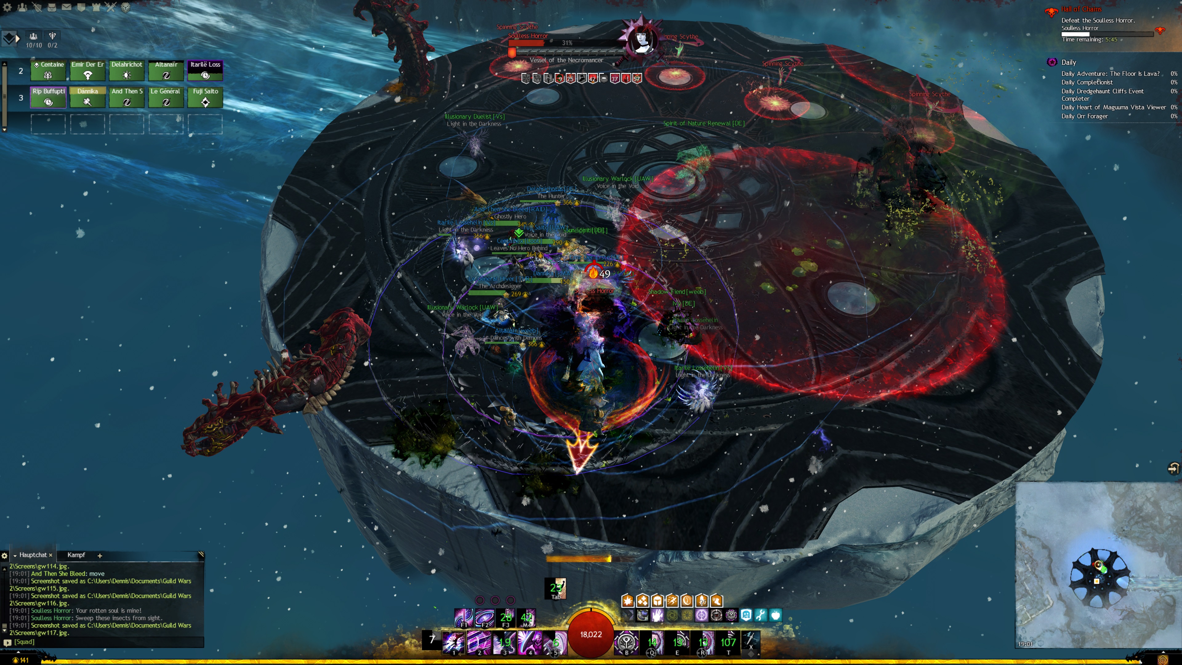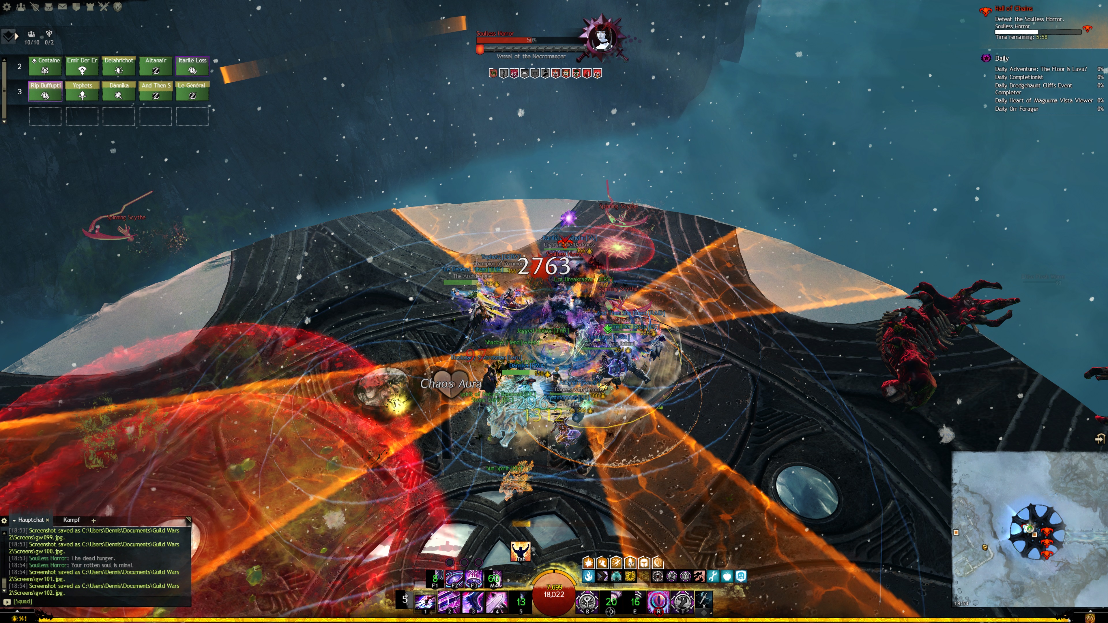Druide durch die Barriere etwas entlastet wird und sich mehr auf das Pushen konzentrieren kann. Für alle Spieler soll an dieser Stelle noch mal erwähnt werden, dass der Erfolg des Pushens auch von den Mitspielern abhängt. Eine unpassende CC-Fähigkeit kann das Schubsen abbrechen. Seid euch daher bewusst, welche CC-Fähigkeiten Ihr dabeihabt. Da der Seelenlose Schrecken relativ häufig angreift, sind Klassen, die viel