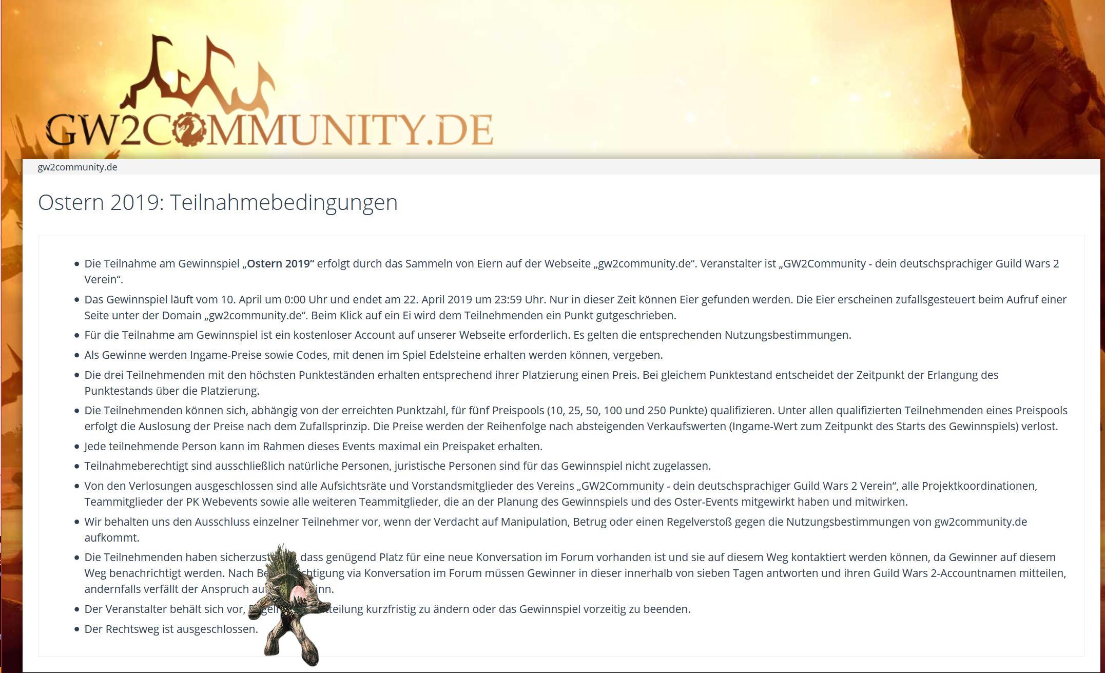 - Die Teilnahme am Gewinnspiel „Ostern 2019“ erfolgt durch das Sammeln von Eiern auf der Webseite „gw2community.de“. Veranstalter ist „GW2Community - dein deutschsprachiger Guild Wars 2 Verein“.