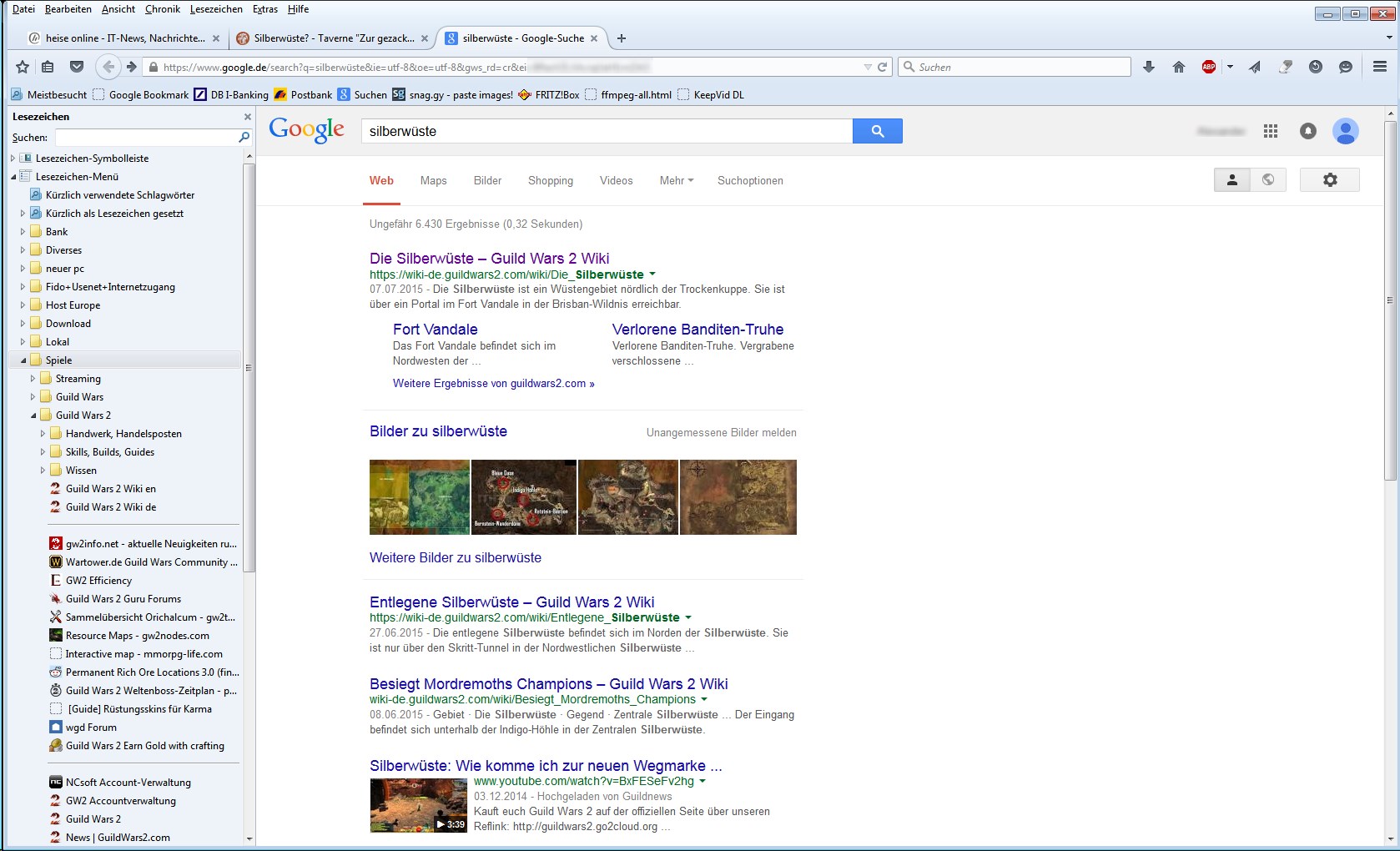 • Ich möchte jetzt nicht pampig erscheinen, und die folgende Frage ist ganz sachlich und ohne Hintergedanken gemeint: wo besteht das Problem mit der Google Suche? Wenn ich mit meinem Webbrowser nach "silberwüste" bei Google suche, dann bleibt wirklich keine Frage offen. Jeder Link auf der ersten Ergebnisseite beschäftigt sich mit der Guild Wars 2 Silberwüste, und der erste Link führt direkt zum offiziellen wiki. Ich hänge mein google-Ergebnis zur Verdeutlichung an.