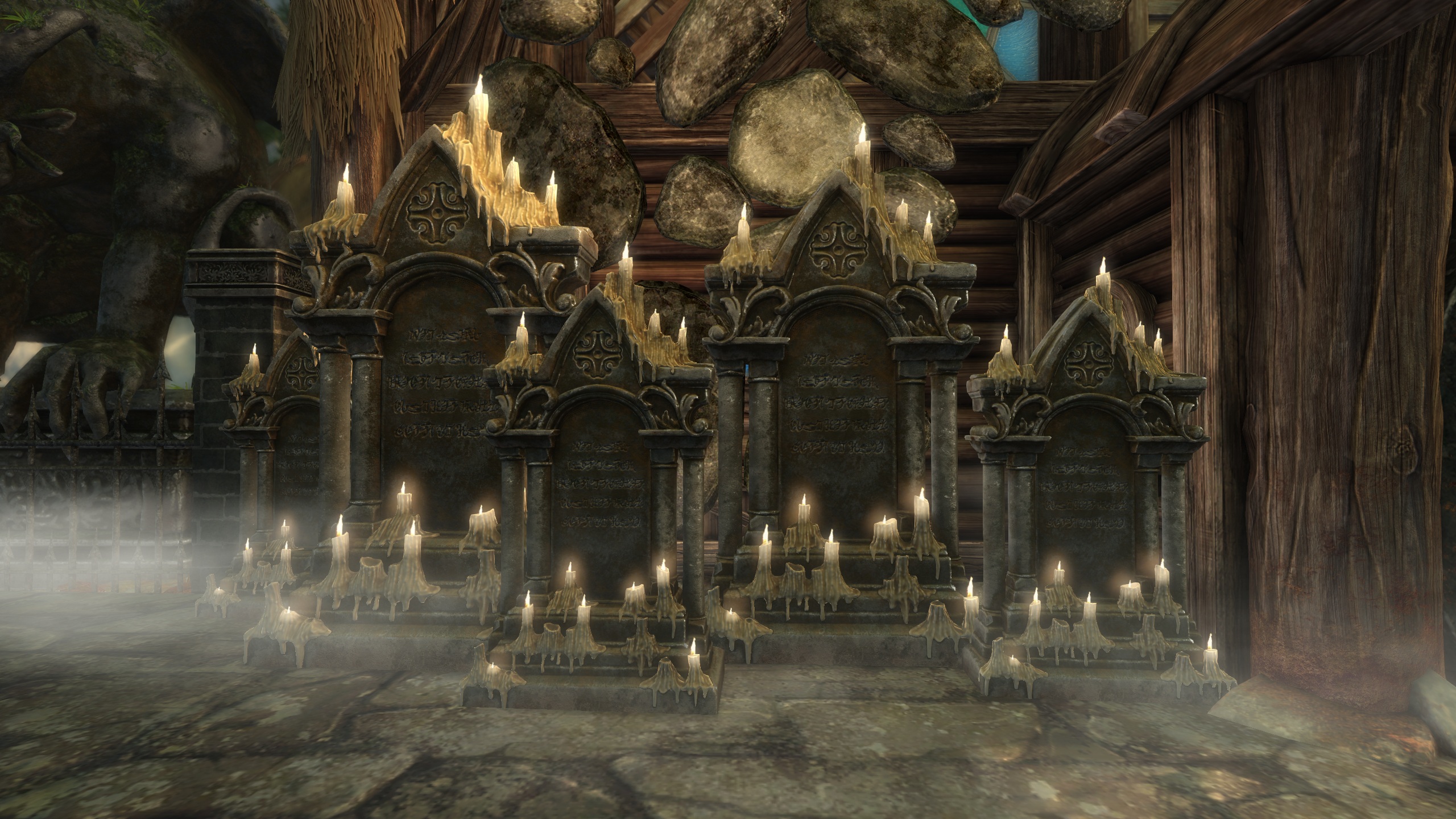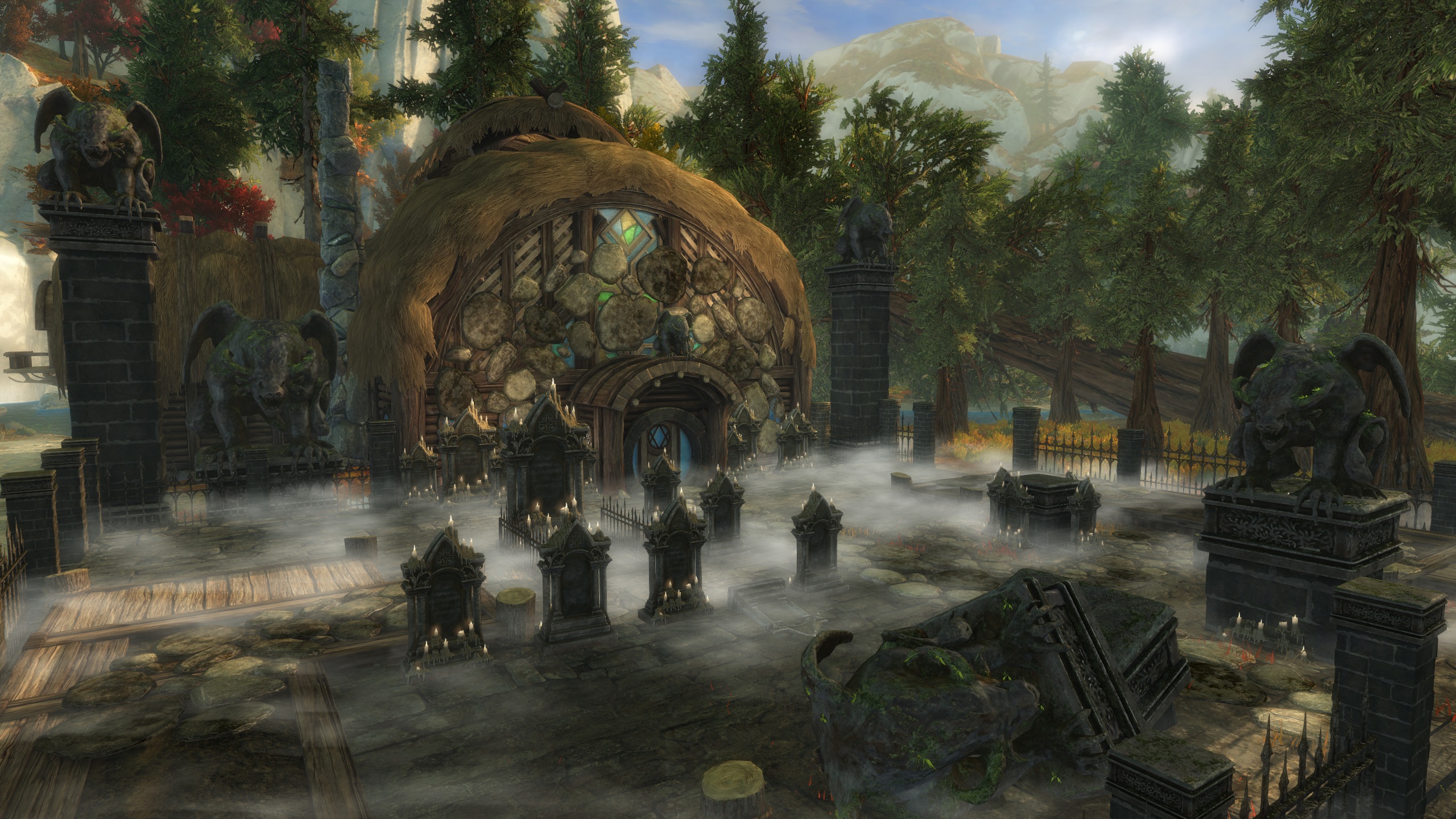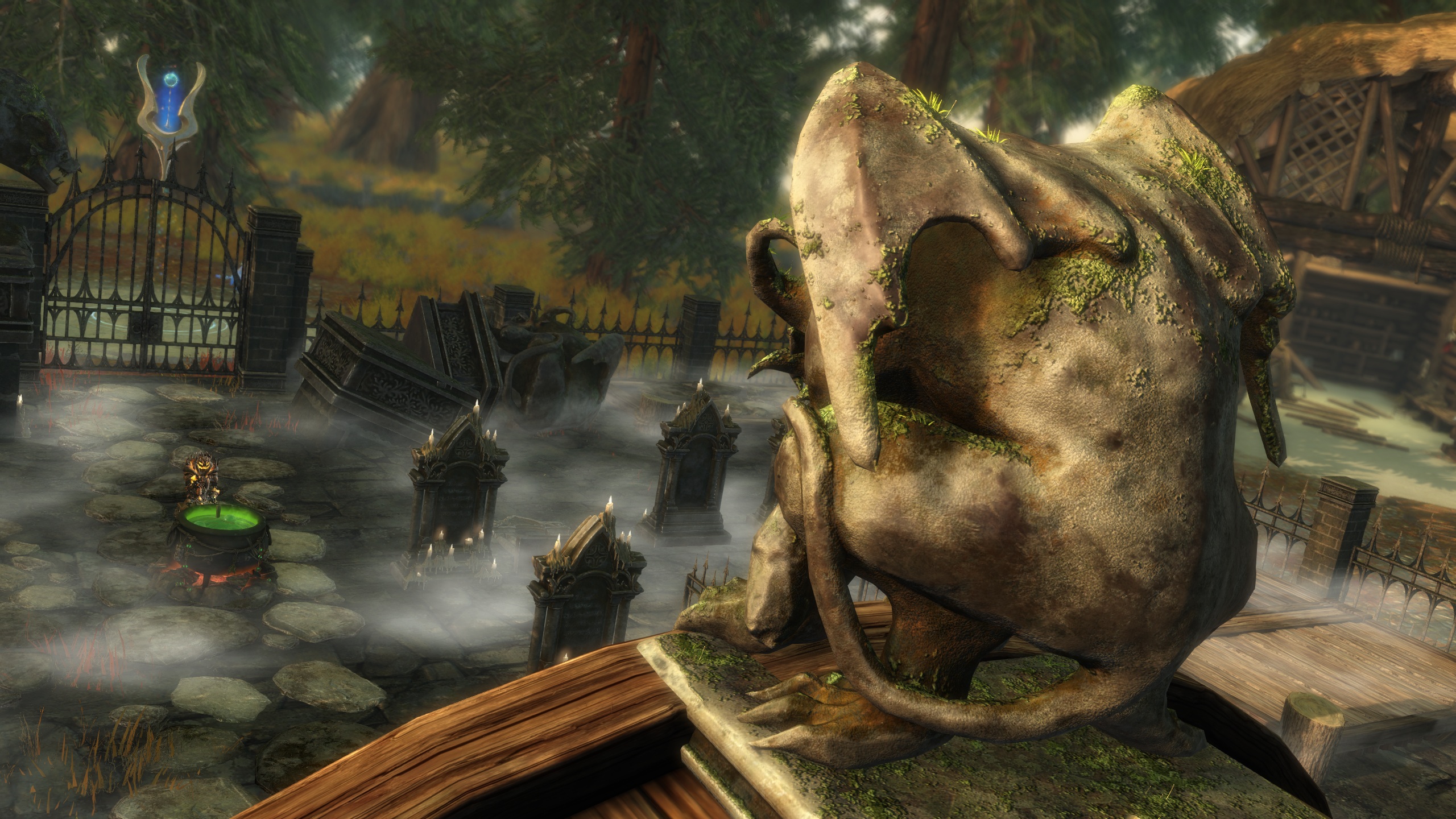 Ein übernatürlicher Nebel erwartet uns: Im Oktober erwacht die schauderhafteste Jahreszeit von allen. Baut einen nebelverhangenen Friedhof, um die Gefallenen zu ehren, oder dekoriert einfach eure Heimstatt zu Halloween! Das Friedhofs-Heimstatt-Paket beinhaltet jeweils eine Einheit jeder Dekoration und schaltet ihre Rezepte frei, damit ihr mehr davon herstellen könnt! Dieses Paket ist für 800 Edelsteine erhältlich und enthält die folgenden dekorativen Gegenstände: