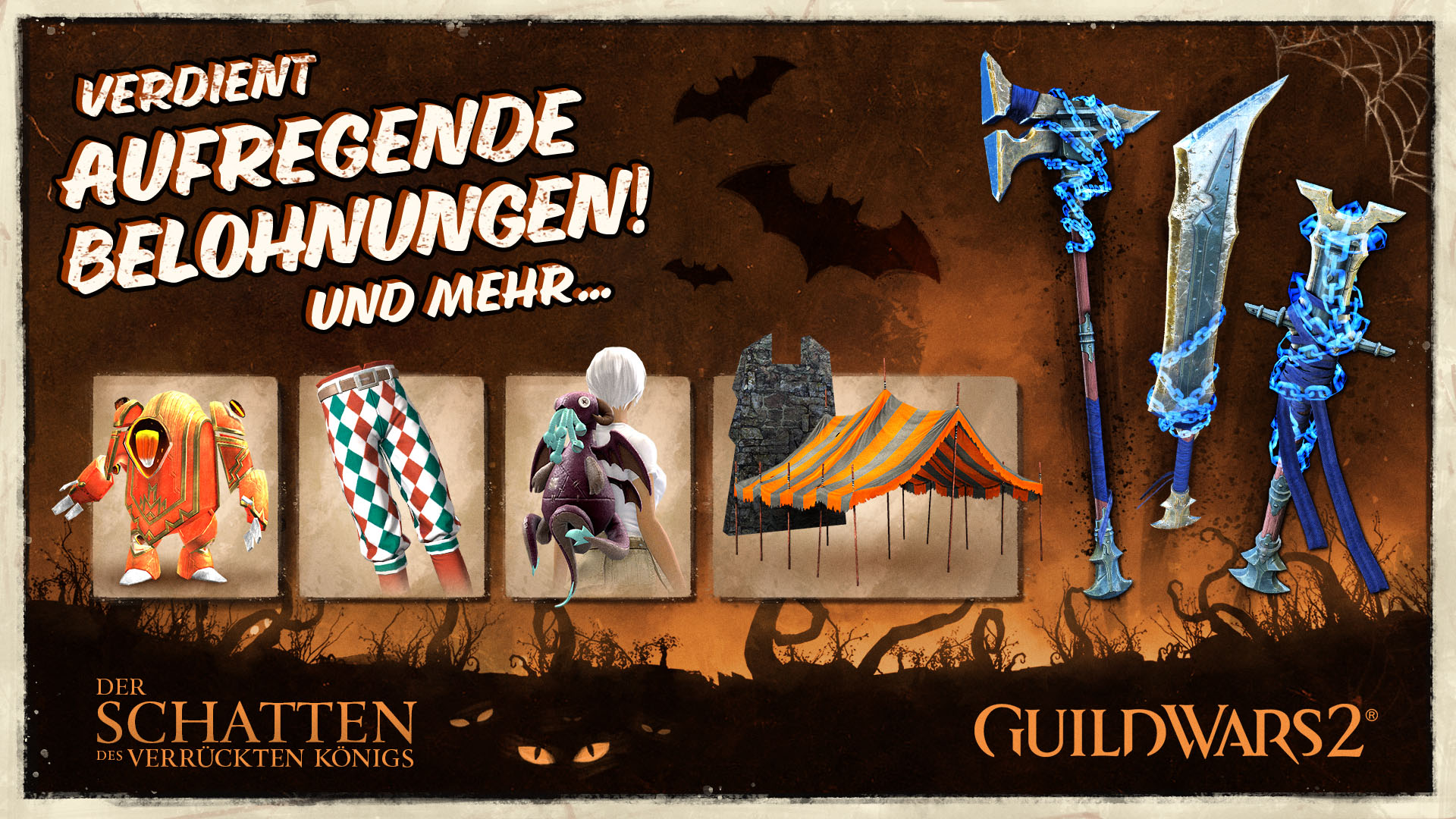 Der Metaerfolg „Halloween-Rituale (jährlich)“ wurde mit einer neuen modischen Belohnung aktualisiert – der Hose des Verrückten Hofnarrens. Verdient euch dieses komische neue Rüstungsteil, indem ihr eine Reihe verschiedener Halloween-Aktivitäten abschließt und stolz eure Loyalität gegenüber dem Hof des Verrückten Königs zeigt. Falls euch die Metaerfolg-Belohnung des letzten Jahres, der „Krallender Schatten“-Teller, entgangen ist, könnt ihr sie jetzt bei den Halloween-Händlern kaufen.